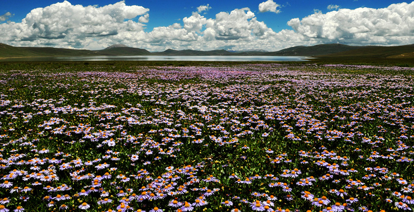 清晨的草原宁静而美丽,早餐后驱车前往年吉措湖欣赏壮美的草原花海(车程约120公里 /2.5小时)。每年7月至8月,湖畔的各种野花竞相开放,一群群斑头雁在清澈的湖面上荡起一圈圈涟漪,和远处隐约的山色构成一幅幅唯美画卷。抵达后,沿着湖畔漫步于南岸的花海,这里的花海辽阔壮观、赏心悦目。随后,来到湖的西岸,这里的花海更加艳丽,数不清的野菊花以及无名的小黄花遍布整个草原,蔚为壮观。